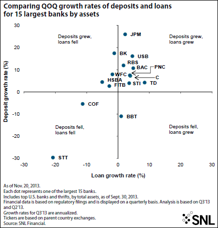 Among the top 15 banks by assets, only BB&T Corp., Capital One Financial Corp. and State Street Corp. saw deposits fall quarter over quarter. "While average total deposits were lower this quarter, noninterest-bearing deposits grew 8% annualized consistent with our mix improvement goals," BB&T Chairman, President and CEO Kelly King noted in the company's third-quarter earnings release. During the company's earnings conference call in October, Capital One CFO Stephen Crawford cited a decrease in earning assets during the third quarter as a prominent factor leading to a drop in the company's interest-bearing deposits. "We have ample deposit funding in a period of relatively low overall loan growth, so we've throttled back on growth in some legacy Capital One deposit businesses," Capital One Chairman, President and CEO Richard Fairbank said on the call. "We continued to see growth in checking accounts across our digital and branch deposit franchises."